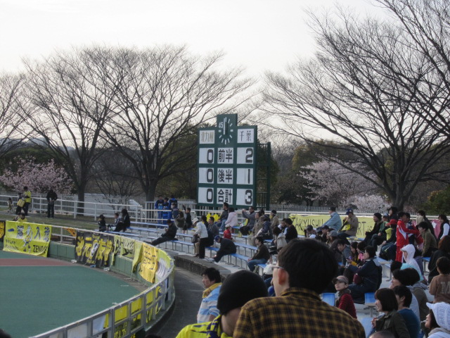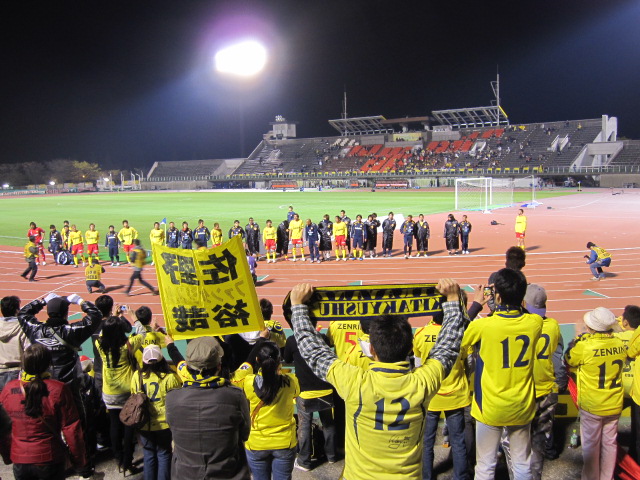 しかし追いつけず。惜しい場面は何度かあったけどなー。同点の場面で惜しい場面が続けば、次はやれそうだと思うんだろうけど、負けている場面で惜しいのが続いても、詰めがもう一歩でした、というだけだよなー。やっぱり先行されるとつらい。それでもみんなまた、見に来てくれるといいけどなー。