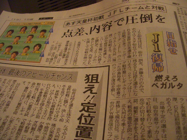 さらに、雑観によれば、ソニー仙台からニューウェーブ北九州の試合のビデオを入手したんだってさ。ソニー仙台の監督などからは「序盤は元気だが、その後は運動量が落ちてくる」という北九州評を仕入れたらしい。