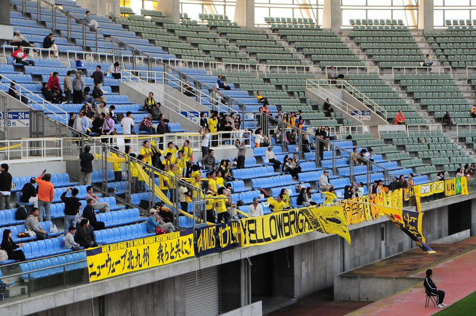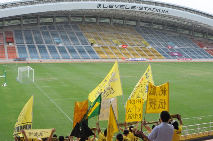 天皇杯なので入場無料のレベスタ。ゲートを入って左側のメーンスタンドが北九州の席。声出し隊は、そのさらにはじっこの方に陣取る。本城でもよくお会いするおなじみの顔触れがそろっている。