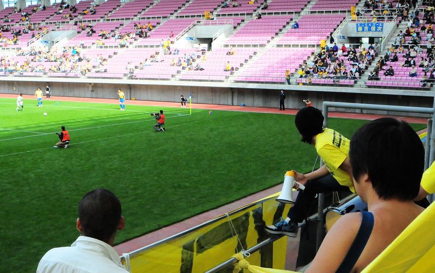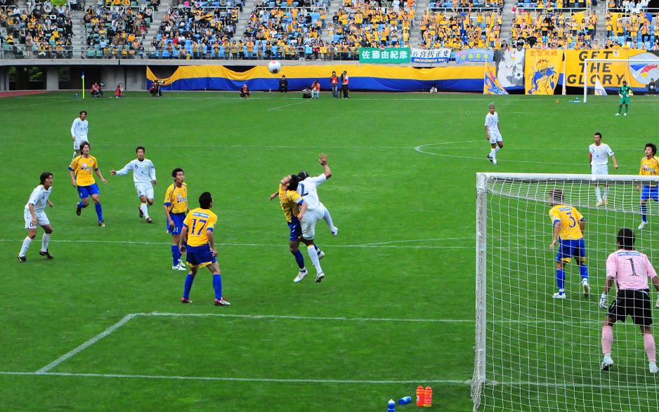 チャンスはまず北九州。8分、抜け出しかけた中嶋が倒された。ゴール正面やや右のペナルティエリアのすぐ外。佐野がFKをけったが、壁にはね返された。そのボールを今度は桑原がシュート! 相手に当たって今度はCK。しかし、結局ゴールには至らず。