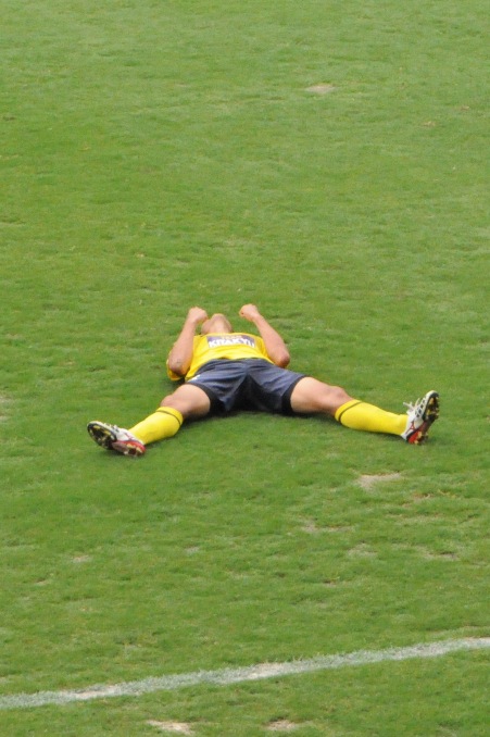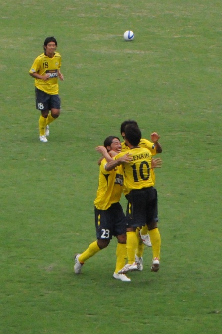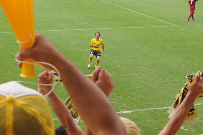 そんなこんなで前半はお互いに無得点。で勝負の後半、先制点は北九州がゲットだ。CKの続きで、前線に残っていた伊藤が、宮川からの折り返しを頭でドン。うおっしゃー。サポはもちろん、伊藤も力いっぱいの喜びの表現だ。うれしいねえ。