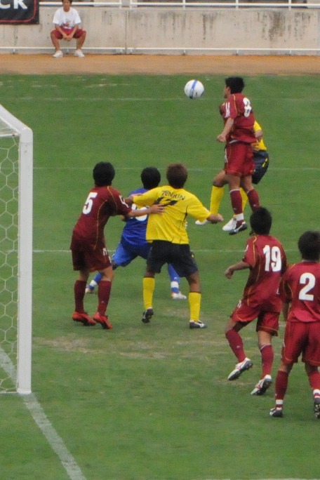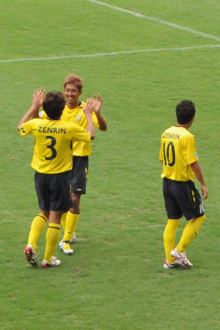 福大には何度か、スピード良く裏に抜け出されかけるが、きっちり対応。昨年の福大戦はピッチ際で見ていたので、福大イレブンのフラストレーションがはっきり分かったけど、きっと今年も学生諸君は、イライラがたまっているだろうなあ。こんなおっさんたち(失礼)相手に何で勝てないんだろ、とか思っていたかもしれん。