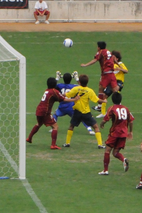 それでもわがイレブン、90分で決着をつける気は満々。残り時間が少なくなってから得たCKで勝ち越し点だ。決めたのは片野。きょうはCB2人で2得点だ。